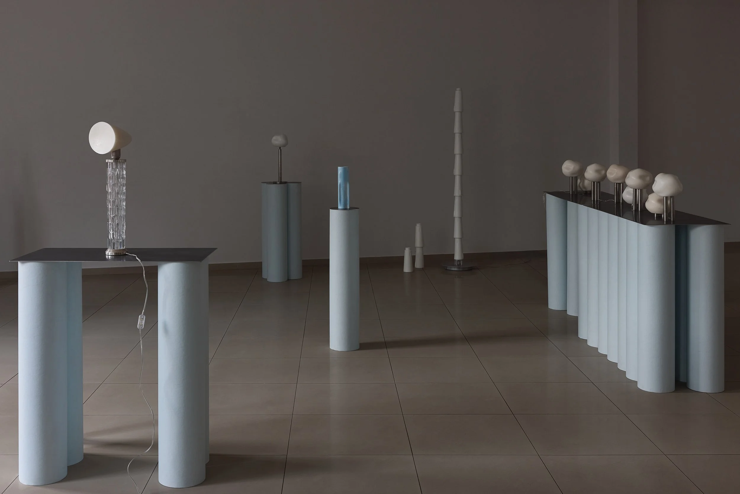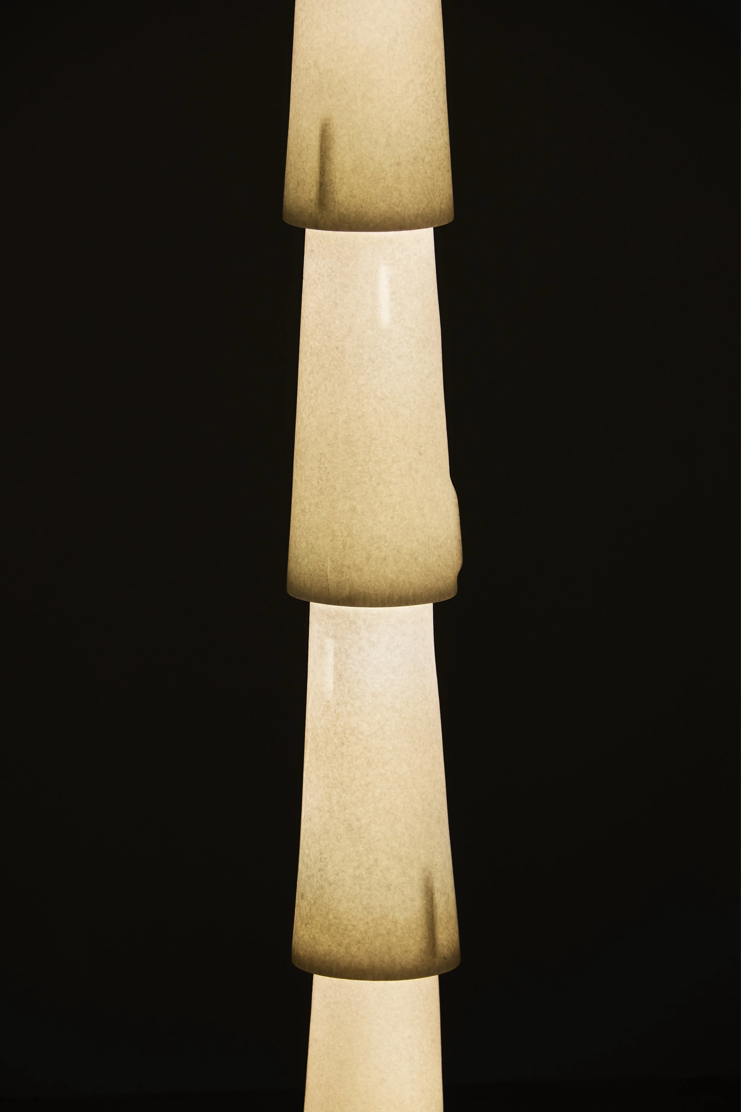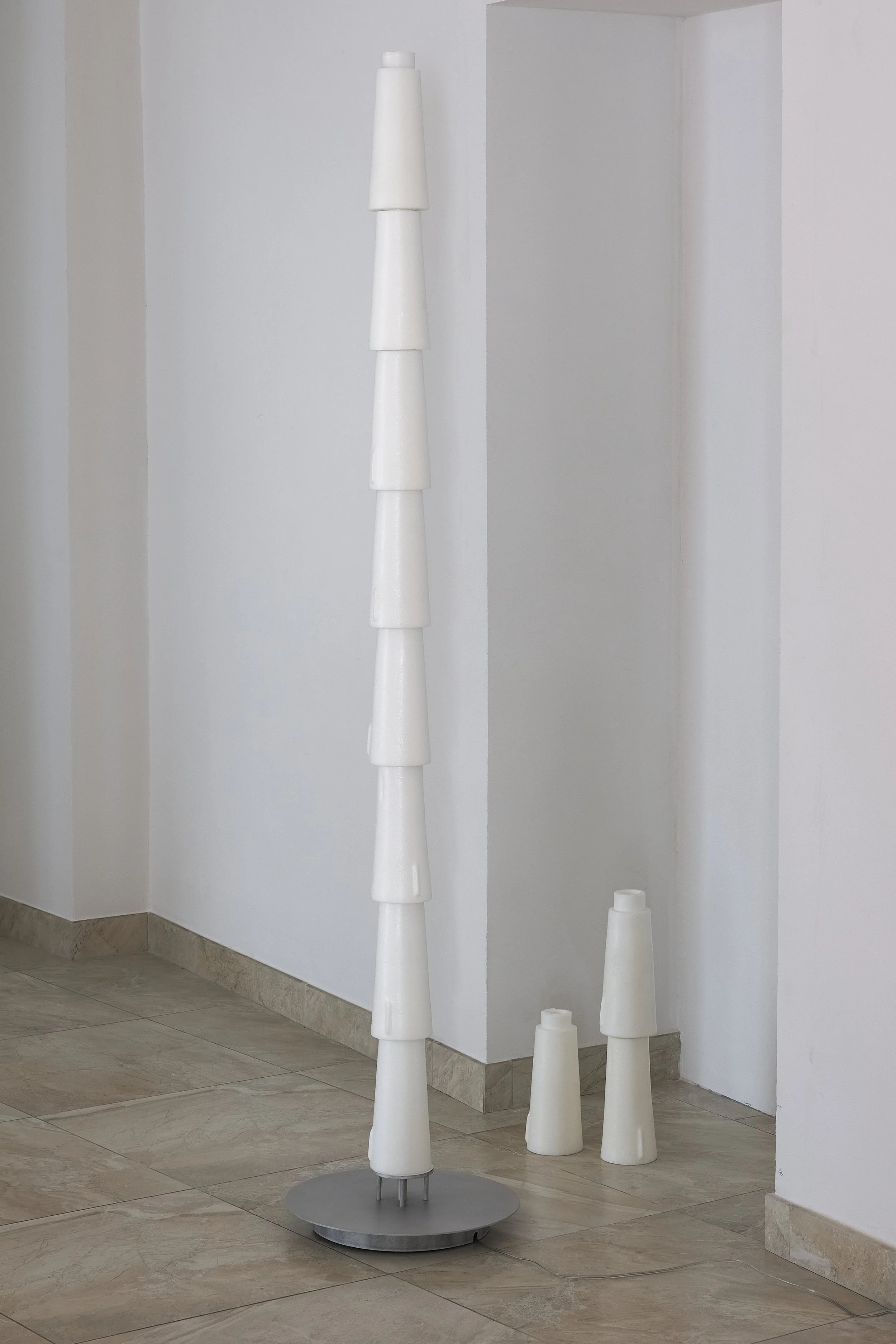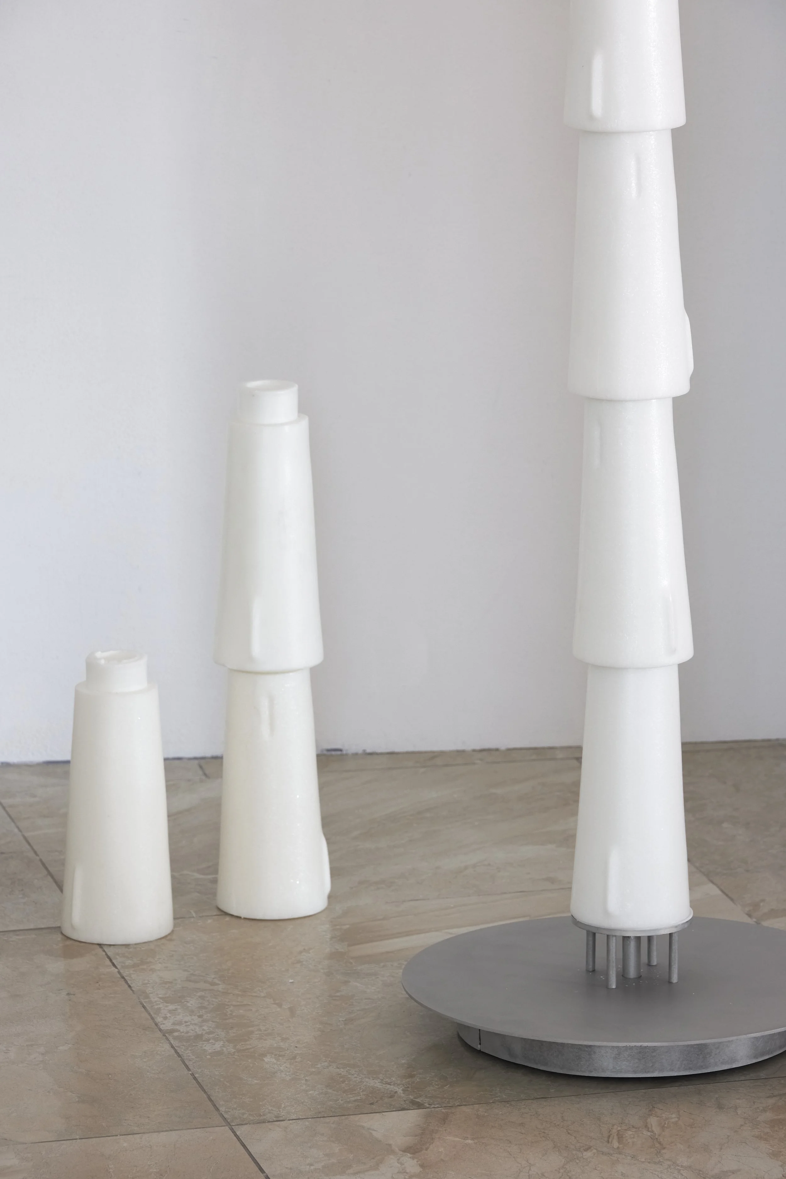 The installation consists of natural wax modules connected into a totem-like forms. The piece can be adjusted to fit different heights and compositions for various spaces.