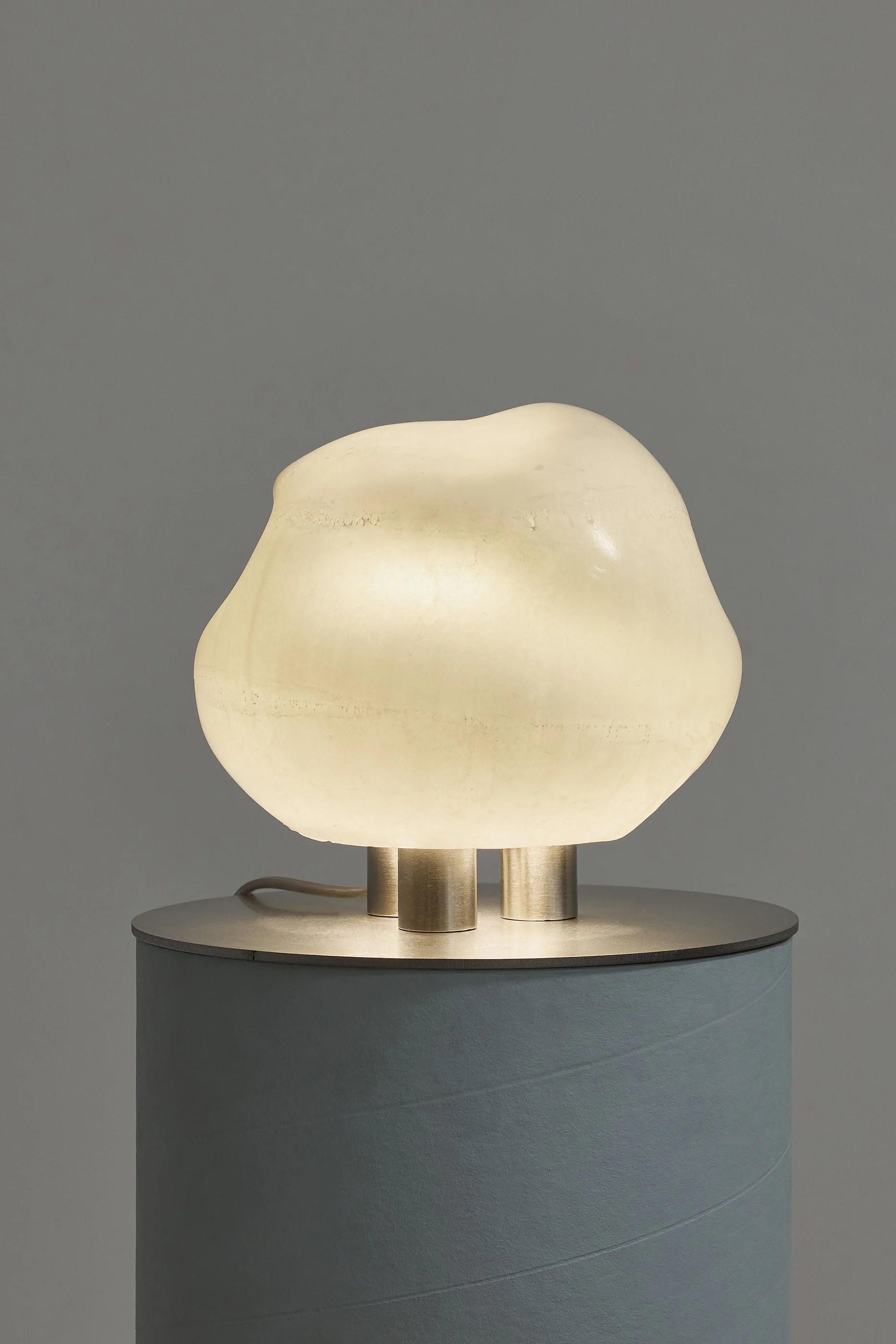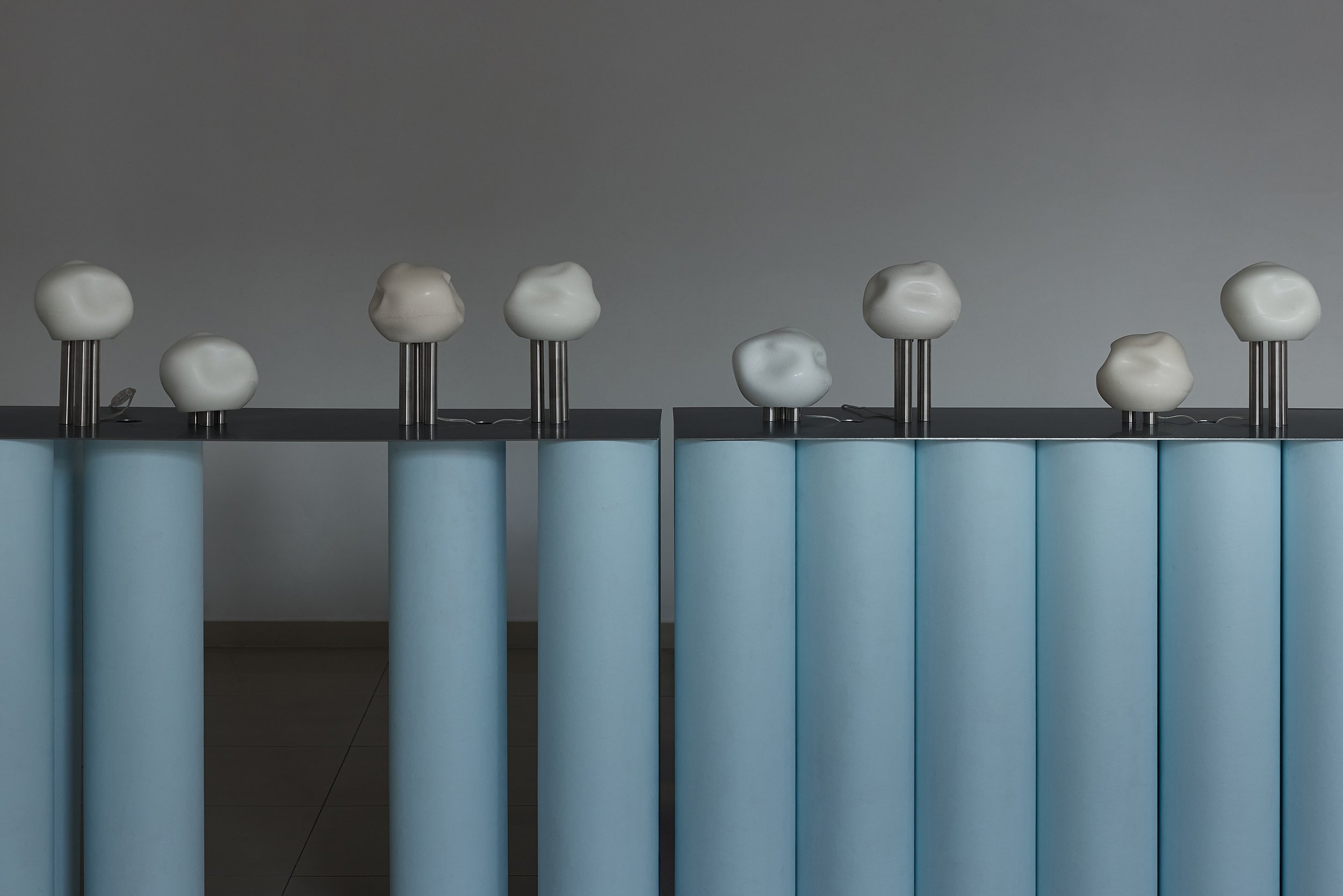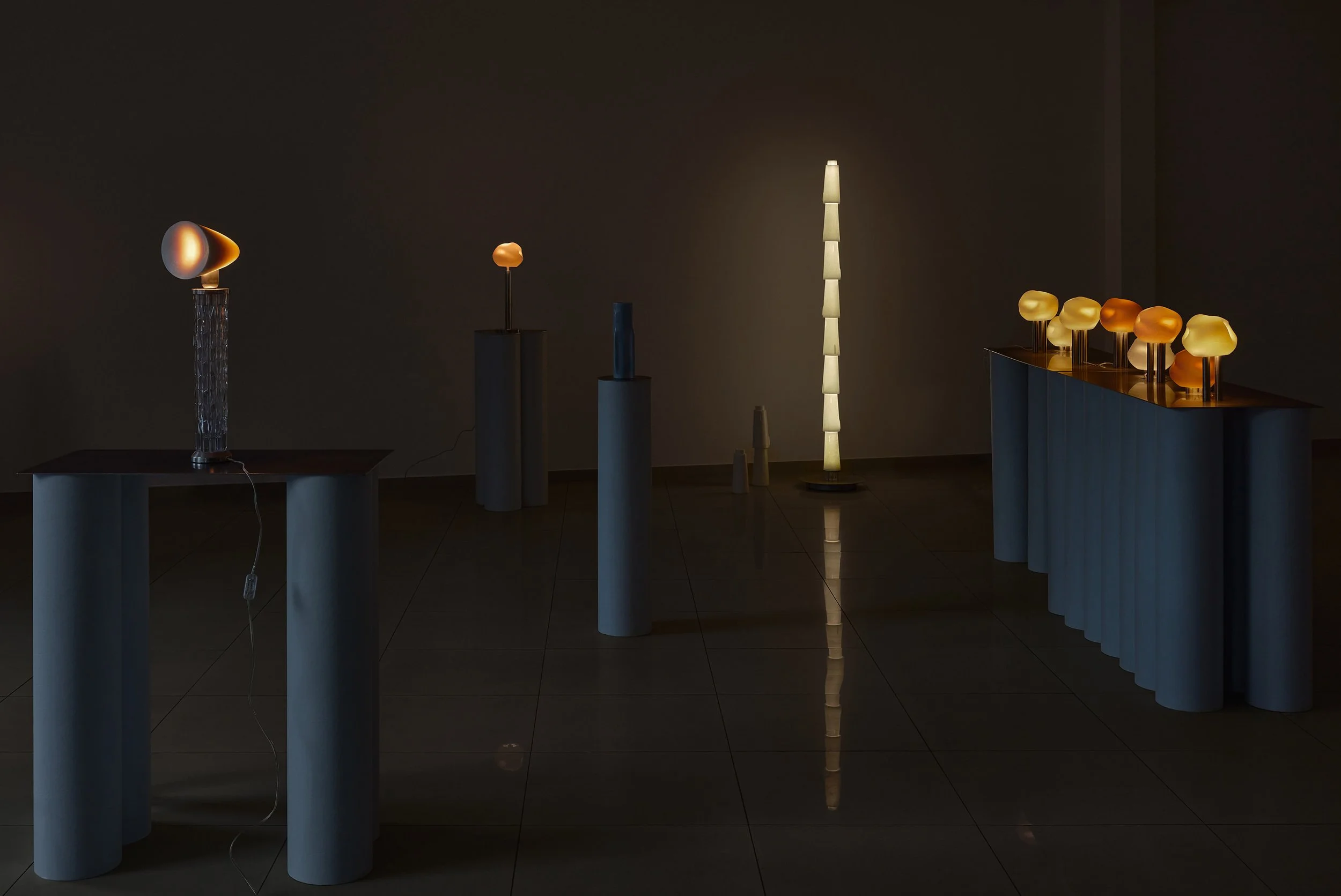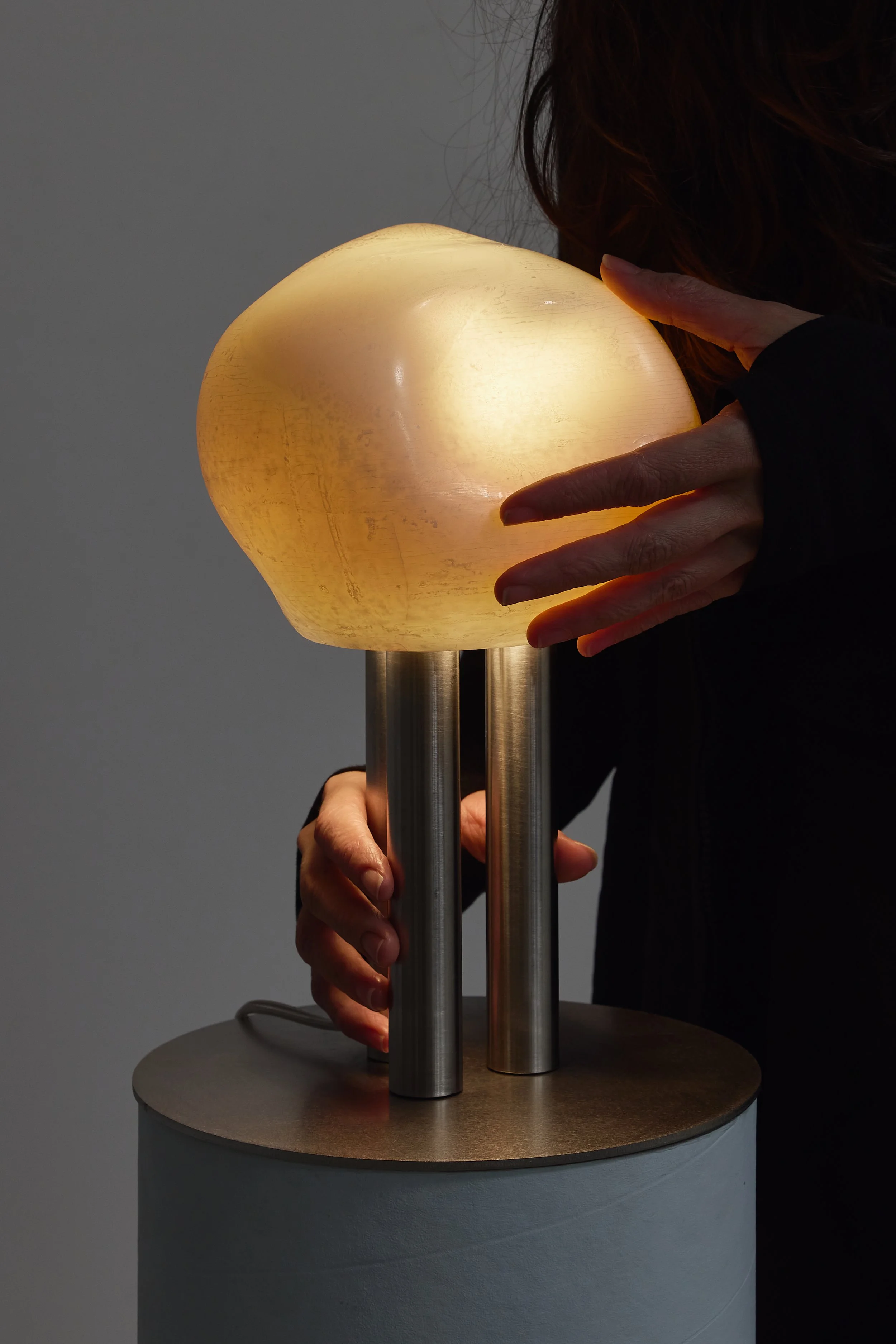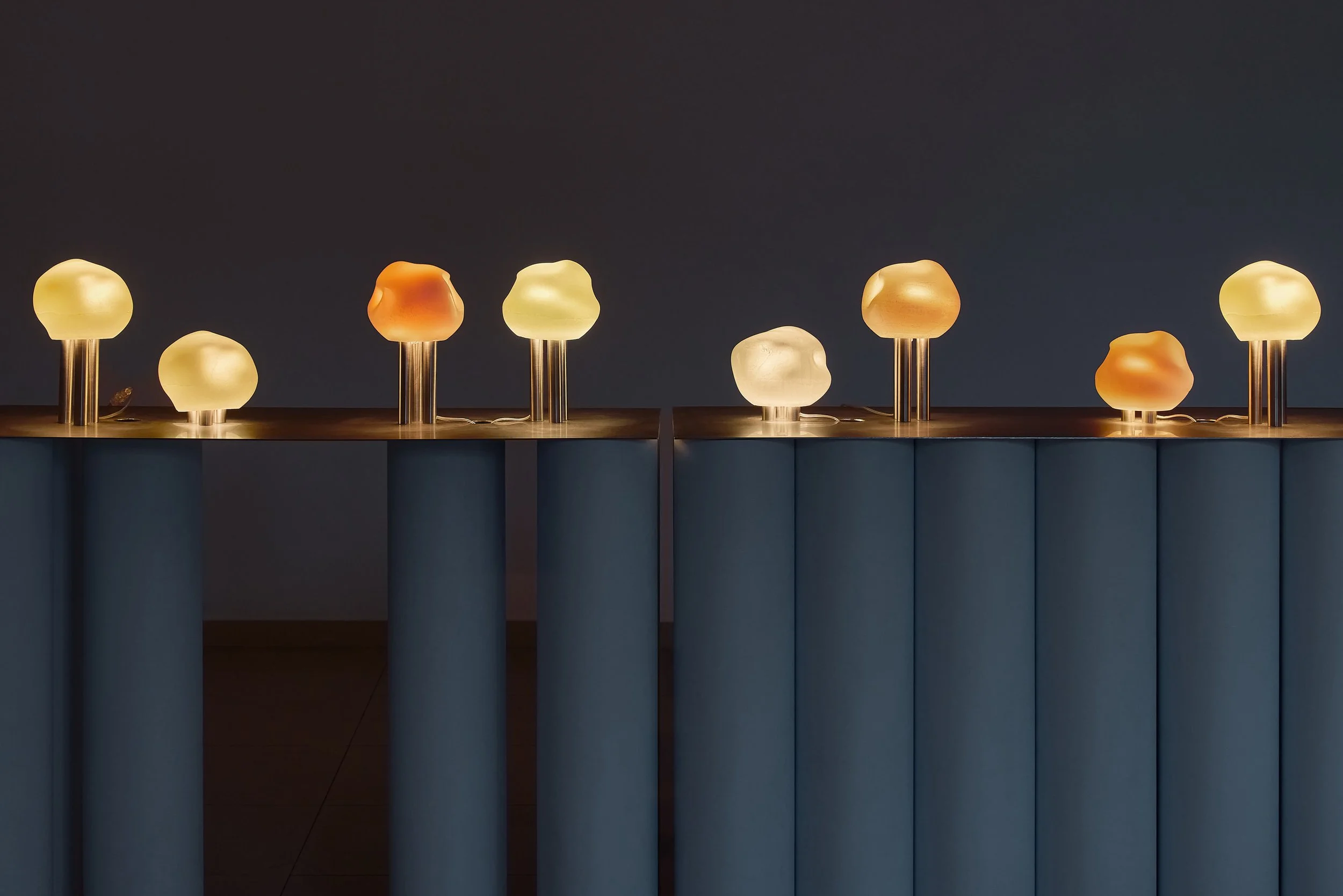 The lighting series features biomorphic forms that symbolize growth and regeneration in nature. The collection was inspired by the organic nature of wax and its capacity to transform from a shapeless mass into a tangible form, reverting to a flexible or even fluid state. A natural wax blend encodes environmentally friendly renewal processes and is seen as a versatile material for creation and upcycling. The fusion of new elements, crafted from natural wax, with existing ones, including metal and glass components, weaves a narrative of nostalgia, grounded in the present, yet projecting towards the future. This approach pays tribute to creative individuality, revitalizing vintage objects with fresh energy and encouraging viewers to recognize their original designs while appreciating their transformed states.